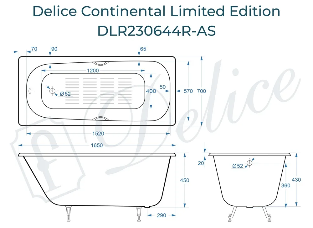 Размерный ряд чугунной ванны Delice Continental Limited Edition: 165х70 см.
