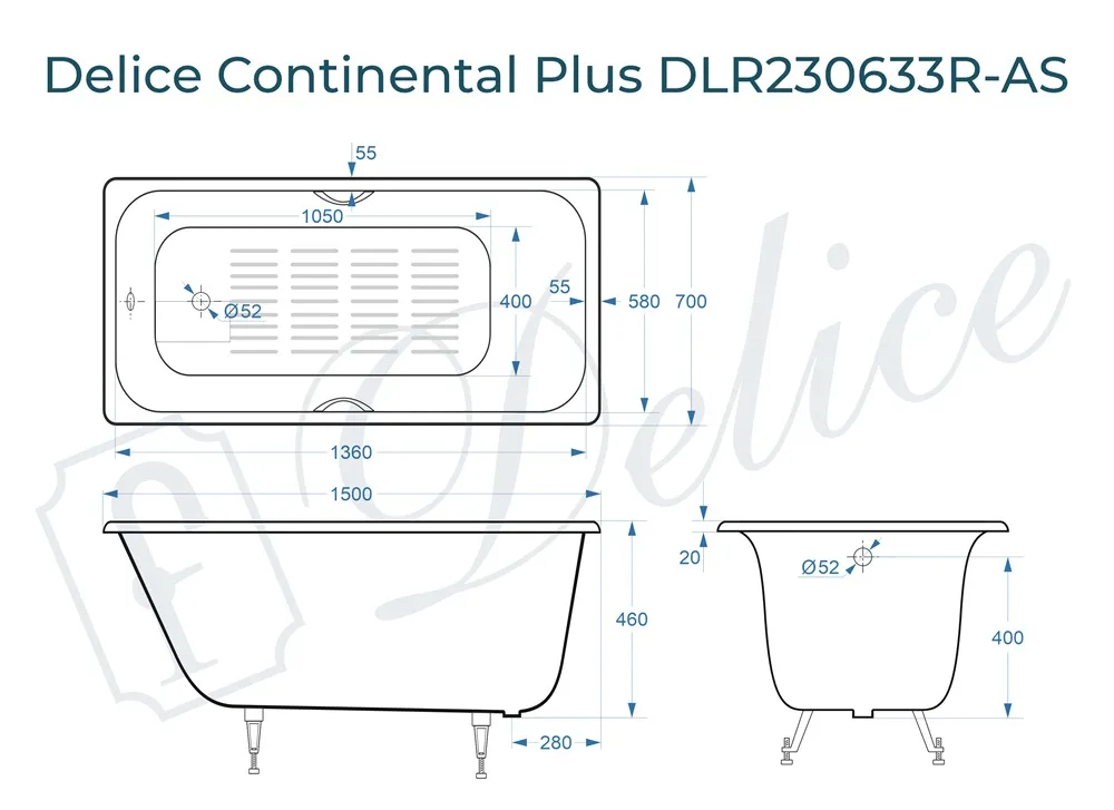 Описание чугунной ванны Delice Continental PLUS 150х70 с отверстиями под ручки и антискользящим покрытием