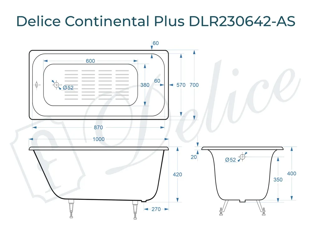 Для установки используются фирменные ножки Delice, которые имеют надежное и прочное крепление, обеспечивают высокую устойчивость ванны и регулируются по высоте. Высота на ножках варьируется от 52 до 60 см. Ножки выполнены из высокопрочного чугуна марки СЧ25, который выдерживает большие нагрузки. Для модели Continental PLUS подходит комплект ножек для серии Elite - артикул DLR000033.