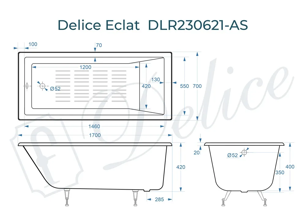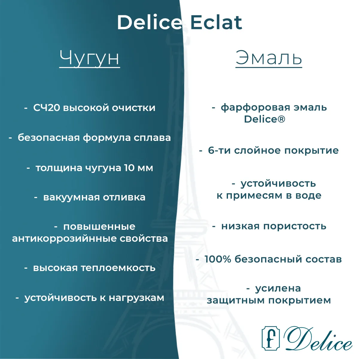 Для установки используются фирменные ножки Delice, которые имеют надежное и прочное крепление, обеспечивают высокую устойчивость ванны и регулируются по высоте. Высота на ножках варьируется от 55 до 59.5 см. Ножки выполнены из высокопрочного чугуна марки СЧ25, который выдерживает большие нагрузки. Для модели Eclat подходит комплект ножек для серии Elite - артикул DLR000002.