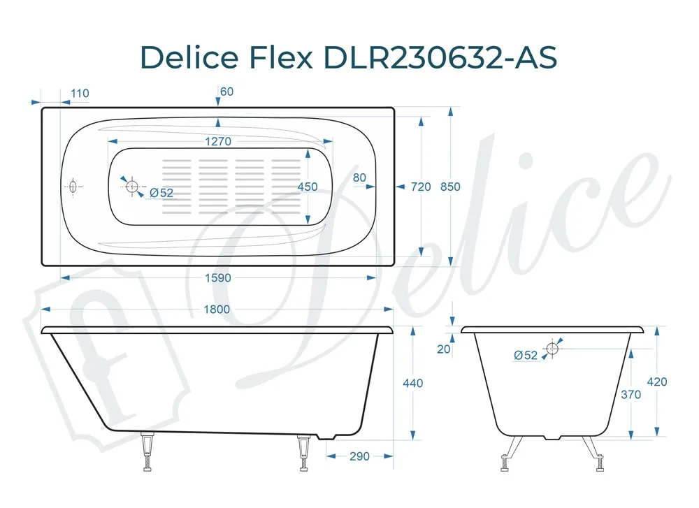 Для установки используются фирменные ножки Delice, которые имеют надежное и прочное крепление, обеспечивают высокую устойчивость ванны и регулируются по высоте. Высота на ножках варьируется от 58 до 62 см. Ножки выполнены из высокопрочного чугуна марки СЧ25, который выдерживает большие нагрузки. Для модели Flex подходит комплект ножек для серии Elite - артикул DLR000033.