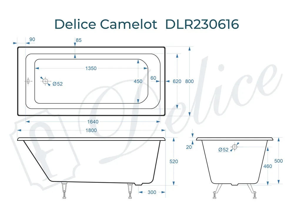 Для установки используются фирменные ножки Delice, которые имеют надежное и прочное крепление, обеспечивают высокую устойчивость ванны и регулируются по высоте. Высота на ножках варьируется от 63 до 67.5 см. Ножки выполнены из высокопрочного чугуна марки СЧ25, который выдерживает большие нагрузки. Для модели Camelot подходит комплект ножек для серии Elite - артикул DLR000002.