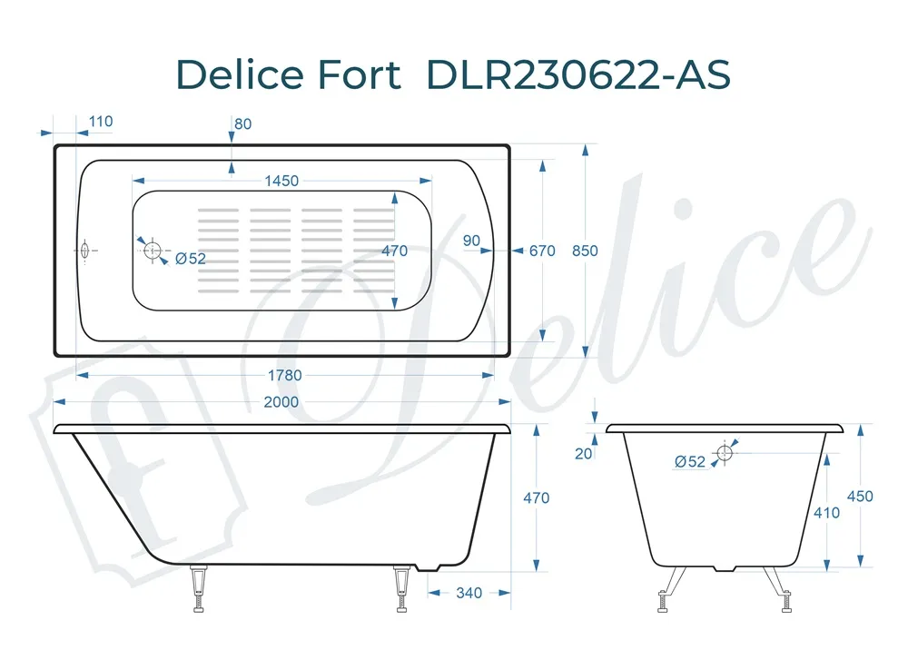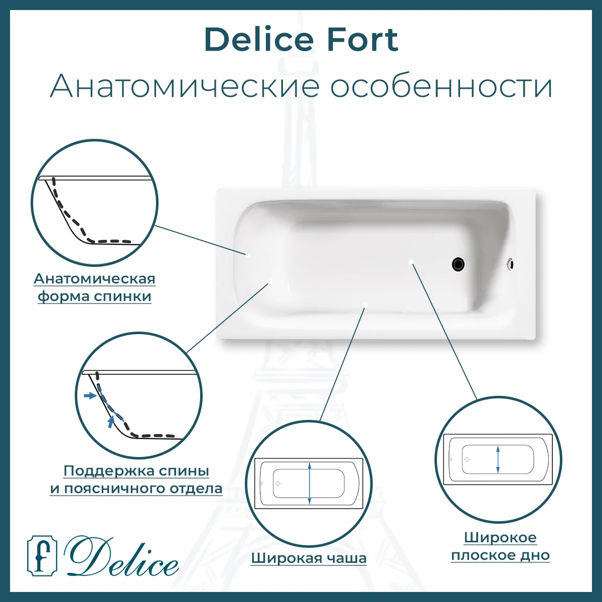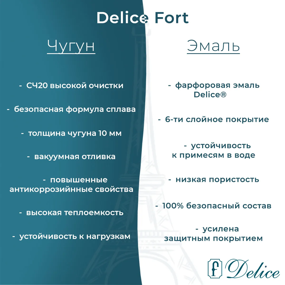 Для установки используются фирменные ножки Delice, которые имеют надежное и прочное крепление, обеспечивают высокую устойчивость ванны и регулируются по высоте. Высота на ножках варьируется от 59 до 63.5 см. Ножки выполнены из высокопрочного чугуна марки СЧ25, который выдерживает большие нагрузки. Для модели Fort подходит комплект ножек для серии Elite - артикул DLR000033.