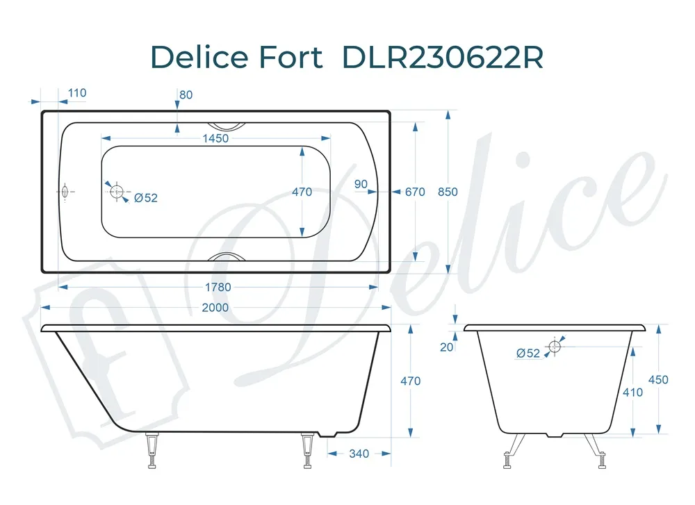 Для установки используются фирменные ножки Delice, которые имеют надежное и прочное крепление, обеспечивают высокую устойчивость ванны и регулируются по высоте. Высота на ножках варьируется от 59 до 63.5 см. Ножки выполнены из высокопрочного чугуна марки СЧ25, который выдерживает большие нагрузки. Для модели Fort подходит комплект ножек для серии Elite - артикул DLR000033.