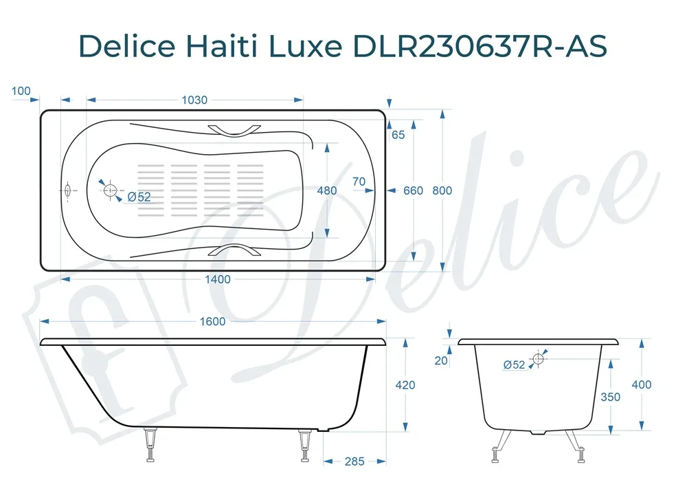 Описание чугунной ванны Delice Haiti Luxe 160х80 с отверстиями под ручки и антискользящим покрытием