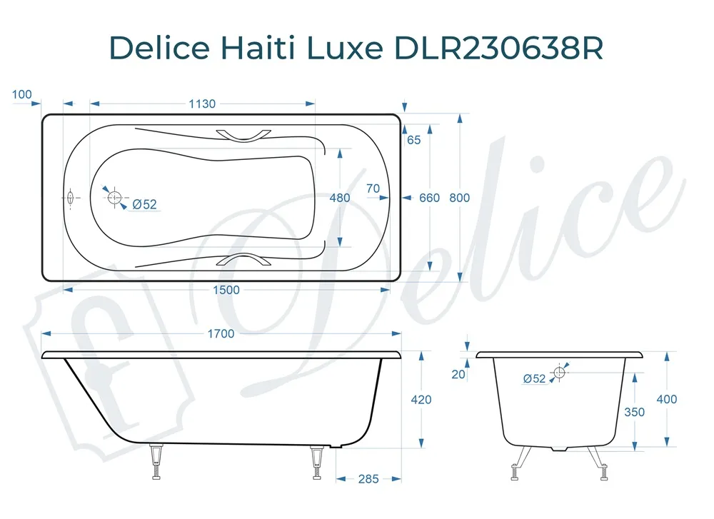Описание чугунной ванны Delice Haiti Luxe 170х80 с отверстиями под ручки