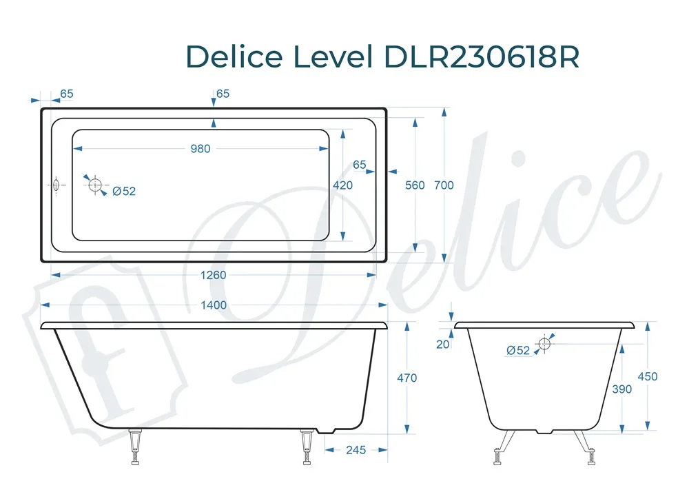 Для установки используются фирменные ножки Delice, которые имеют надежное и прочное крепление, обеспечивают высокую устойчивость ванны и регулируются по высоте. Высота на ножках варьируется от 58 до 62.5 см. Ножки выполнены из высокопрочного чугуна марки СЧ25, который выдерживает большие нагрузки. С помощью регулировки можно нивелировать геометрические отклонения пола, стен и углов в ванной комнате. Для модели Level подходит комплект ножек для серии Elite - артикул DLR000002.