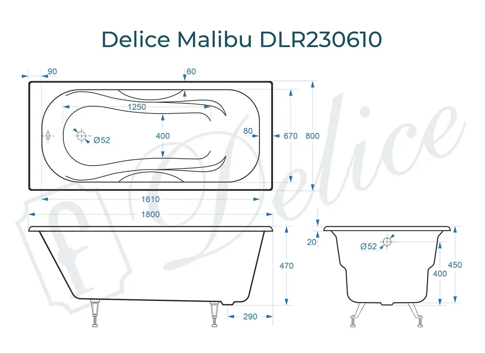 Для установки используются фирменные ножки Delice, которые имеют надежное и прочное крепление, обеспечивают высокую устойчивость ванны и регулируются по высоте. Высота на ножках варьируется от 58 до 62.5 см. Ножки выполнены из высокопрочного чугуна марки СЧ25, который выдерживает большие нагрузки. С помощью регулировки можно нивелировать геометрические отклонения пола, стен и углов в ванной комнате. Для модели Malibu подходит комплект ножек для серии Elite - артикул DLR000002.