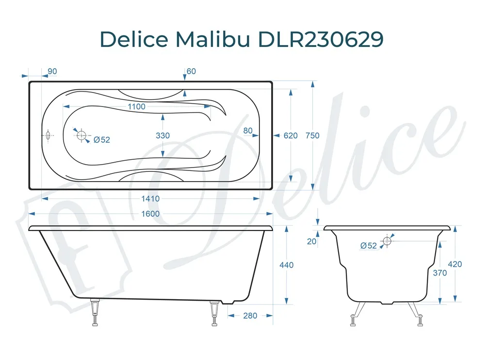 Для установки используются фирменные ножки Delice, которые имеют надежное и прочное крепление, обеспечивают высокую устойчивость ванны и регулируются по высоте. Высота на ножках варьируется от 55 до 59.5 см. Ножки выполнены из высокопрочного чугуна марки СЧ25, который выдерживает большие нагрузки. С помощью регулировки можно нивелировать геометрические отклонения пола, стен и углов в ванной комнате. Для модели Malibu подходит комплект ножек для серии Elite - артикул DLR000033.