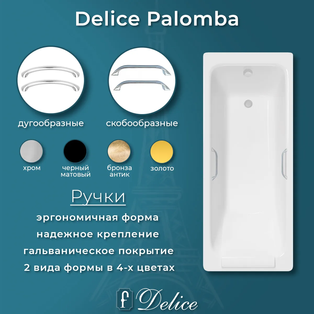 Описание чугунной ванны Delice Palomba 170х70 с отверстиями под ручки