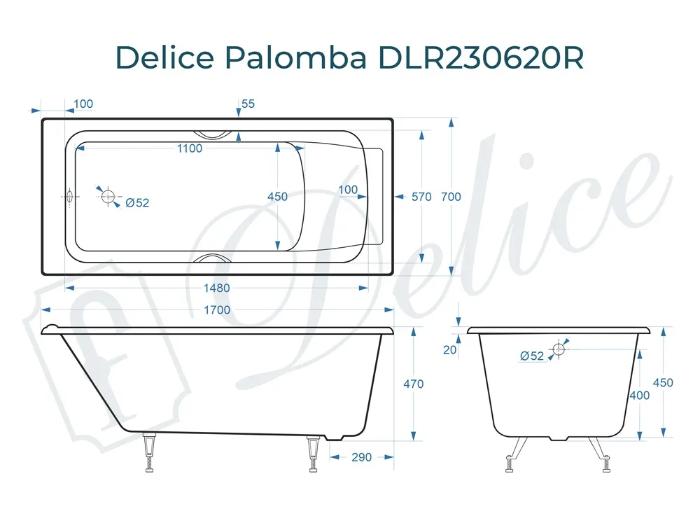Ванна чугунная Delice Palomba DLR230620R 170х70 см, без антискользящего покрытия, с отверстиями под ручки