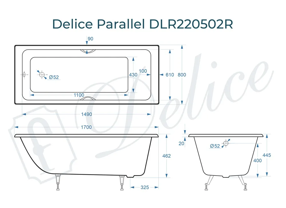 Для установки используются фирменные ножки Delice, которые имеют надежное и прочное крепление, обеспечивают высокую устойчивость ванны и регулируются по высоте. Высота на ножках варьируется от 59.5 до 64.5 см. Ножки выполнены из высокопрочного чугуна марки СЧ25, который выдерживает большие нагрузки. Для модели Parallel подходят ножки для серии Comfort (артикул DLR000001).