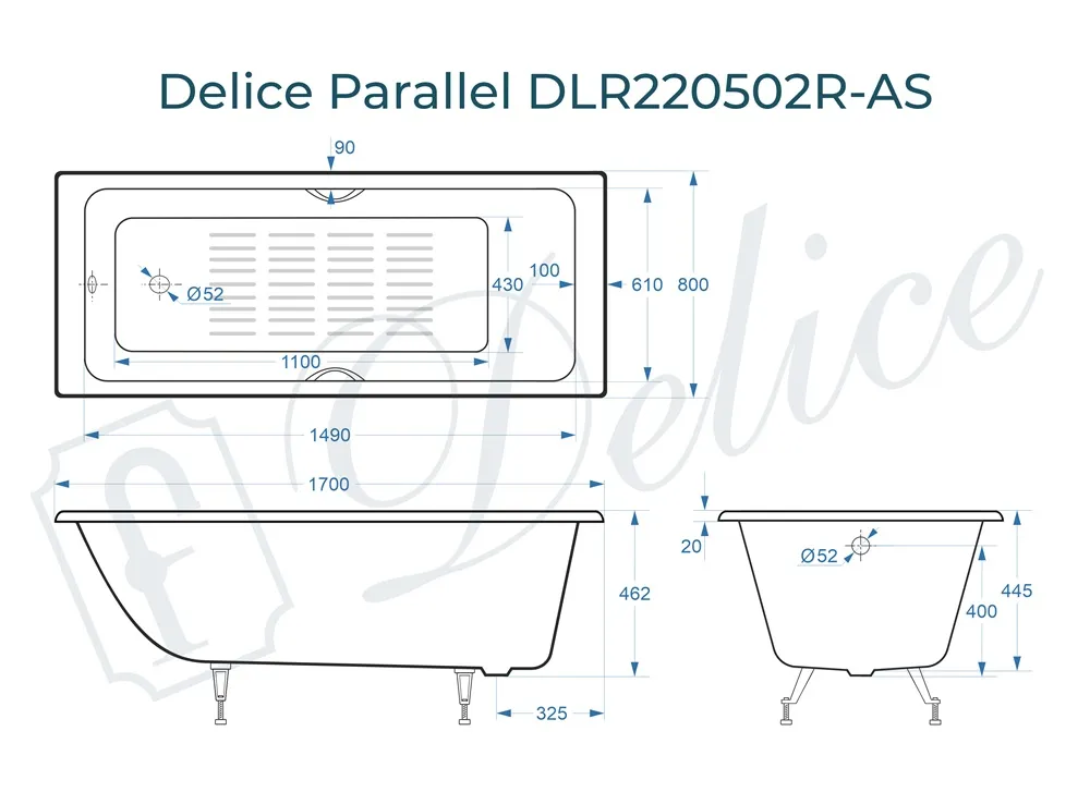 Для установки используются фирменные ножки Delice, которые имеют надежное и прочное крепление, обеспечивают высокую устойчивость ванны и регулируются по высоте. Высота на ножках варьируется от 59.5 до 64.5 см. Ножки выполнены из высокопрочного чугуна марки СЧ25, который выдерживает большие нагрузки. Для модели Parallel подходят ножки для серии Comfort (артикул DLR000001).