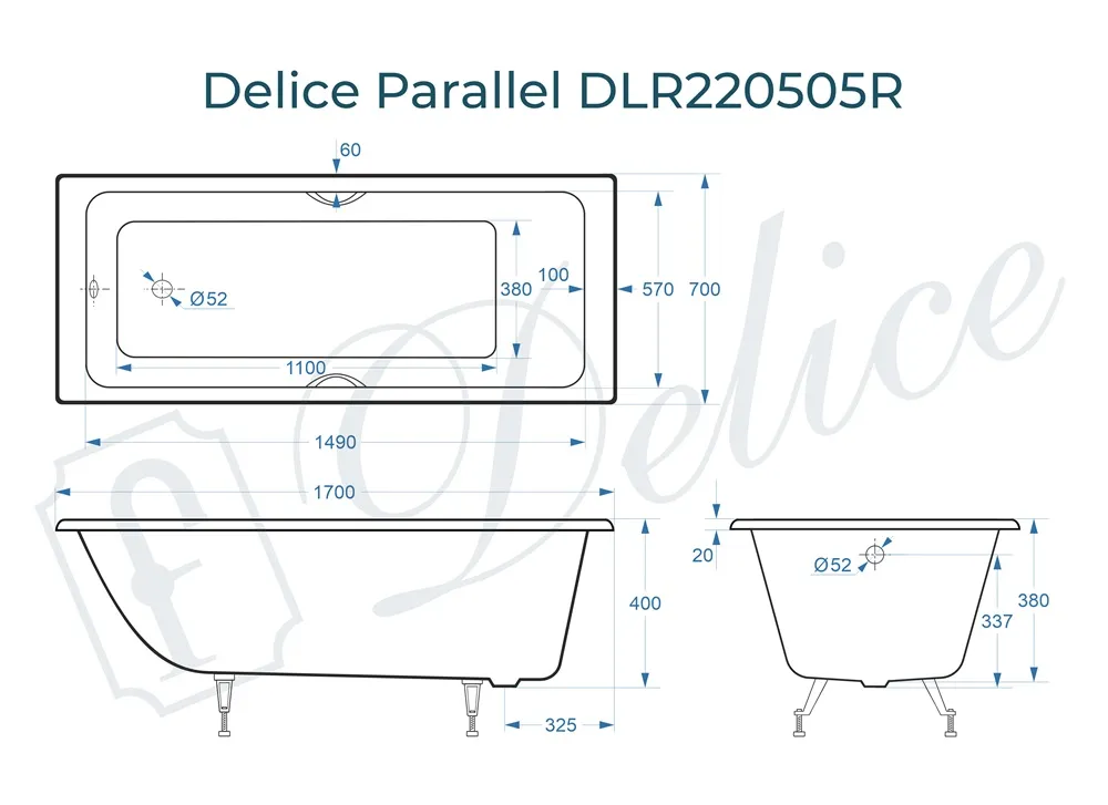 Для установки используются фирменные ножки Delice, которые имеют надежное и прочное крепление, обеспечивают высокую устойчивость ванны и регулируются по высоте. Высота на ножках варьируется от 52.5 до 58 см. Ножки выполнены из высокопрочного чугуна марки СЧ25, который выдерживает большие нагрузки. Для модели Parallel подходят ножки для серии Comfort (артикул DLR000001).
