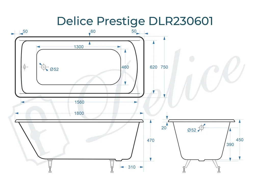 Для установки используются фирменные ножки Delice, которые имеют надежное и прочное крепление, обеспечивают высокую устойчивость ванны и регулируются по высоте. Высота на ножках варьируется от 58 до 62.5 см. Ножки выполнены из высокопрочного чугуна марки СЧ25, который выдерживает большие нагрузки. С помощью регулировки можно нивелировать геометрические отклонения пола, стен и углов в ванной комнате. Для модели Prestige подходит комплект ножек для серии Elite - артикул DLR000002.