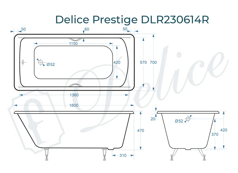 Для установки используются фирменные ножки Delice, которые имеют надежное и прочное крепление, обеспечивают высокую устойчивость ванны и регулируются по высоте. Высота на ножках варьируется от 55 до 59.5 см. Ножки выполнены из высокопрочного чугуна марки СЧ25, который выдерживает большие нагрузки. С помощью регулировки можно нивелировать геометрические отклонения пола, стен и углов в ванной комнате. Для модели Prestige подходит комплект ножек для серии Elite - артикул DLR000033.