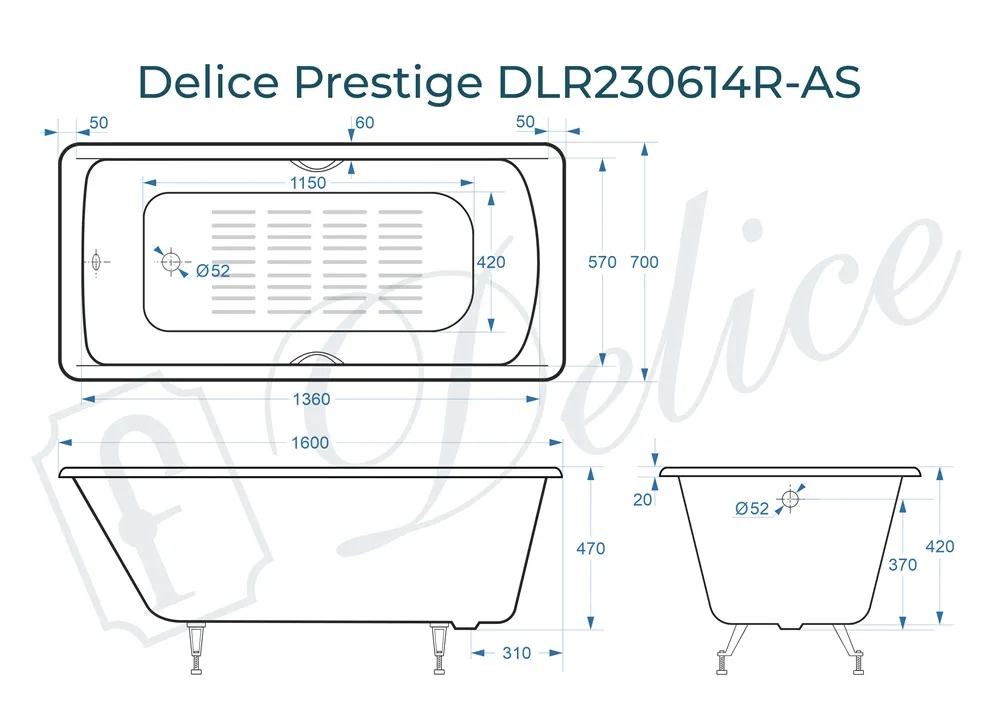 Для установки используются фирменные ножки Delice, которые имеют надежное и прочное крепление, обеспечивают высокую устойчивость ванны и регулируются по высоте. Высота на ножках варьируется от 55 до 59.5 см. Ножки выполнены из высокопрочного чугуна марки СЧ25, который выдерживает большие нагрузки. С помощью регулировки можно нивелировать геометрические отклонения пола, стен и углов в ванной комнате. Для модели Prestige подходит комплект ножек для серии Elite - артикул DLR000033.
