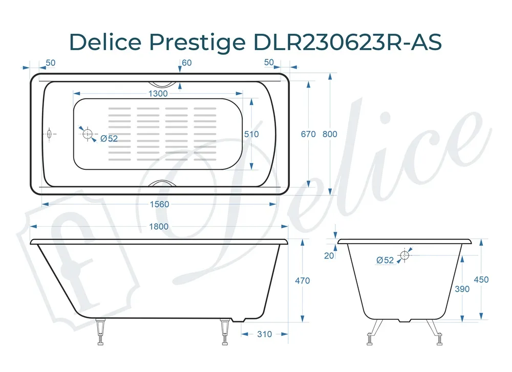 Для установки используются фирменные ножки Delice, которые имеют надежное и прочное крепление, обеспечивают высокую устойчивость ванны и регулируются по высоте. Высота на ножках варьируется от 58 до 62.5 см. Ножки выполнены из высокопрочного чугуна марки СЧ25, который выдерживает большие нагрузки. С помощью регулировки можно нивелировать геометрические отклонения пола, стен и углов в ванной комнате. Для модели Prestige подходит комплект ножек для серии Elite - артикул DLR000033.