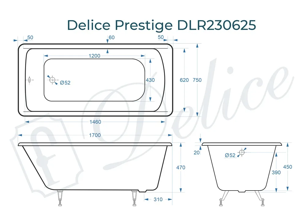 Для установки используются фирменные ножки Delice, которые имеют надежное и прочное крепление, обеспечивают высокую устойчивость ванны и регулируются по высоте. Высота на ножках варьируется от 58 до 62.5 см. Ножки выполнены из высокопрочного чугуна марки СЧ25, который выдерживает большие нагрузки. С помощью регулировки можно нивелировать геометрические отклонения пола, стен и углов в ванной комнате. Для модели Prestige подходит комплект ножек для серии Elite - артикул DLR000033.