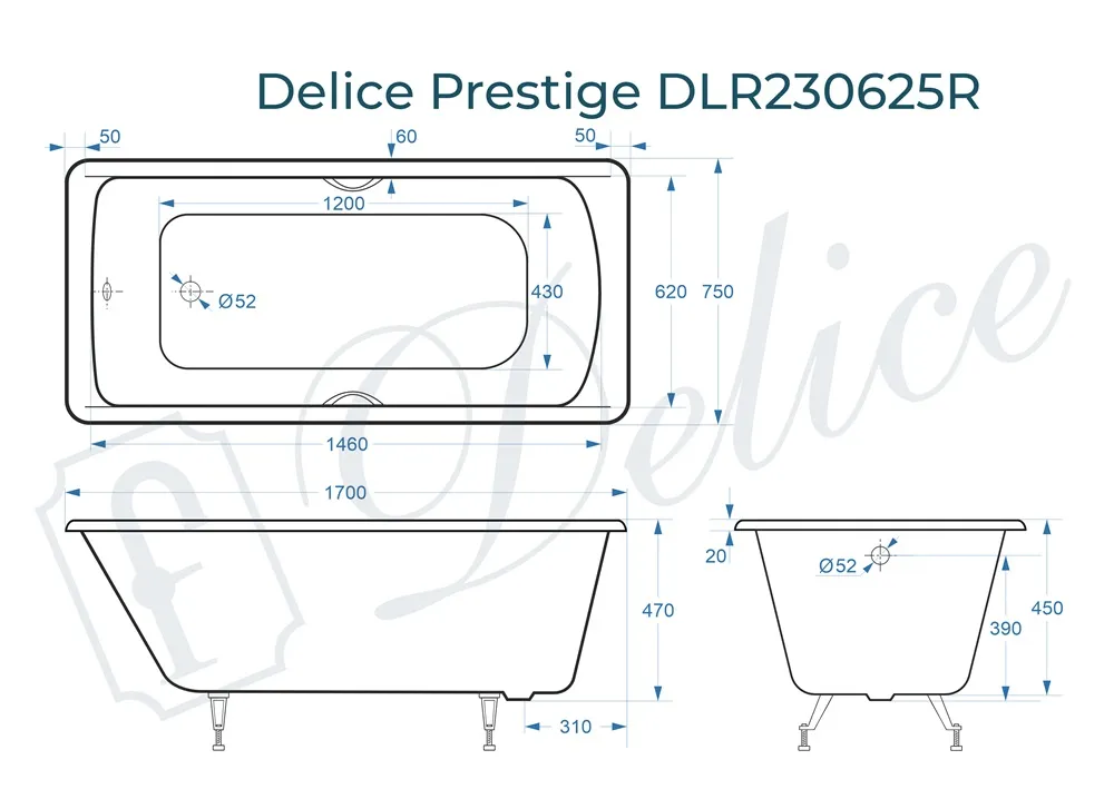Для установки используются фирменные ножки Delice, которые имеют надежное и прочное крепление, обеспечивают высокую устойчивость ванны и регулируются по высоте. Высота на ножках варьируется от 58 до 62.5 см. Ножки выполнены из высокопрочного чугуна марки СЧ25, который выдерживает большие нагрузки. С помощью регулировки можно нивелировать геометрические отклонения пола, стен и углов в ванной комнате. Для модели Prestige подходит комплект ножек для серии Elite - артикул DLR000033.