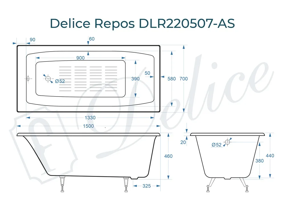 Для установки используются фирменные ножки Delice, которые имеют надежное и прочное крепление, обеспечивают высокую устойчивость ванны и регулируются по высоте. Высота на ножках варьируется от 59.5 до 64.5 см. Ножки выполнены из высокопрочного чугуна марки СЧ25, который выдерживает большие нагрузки. Для модели Repos подходит комплект ножек для серии Comfort.