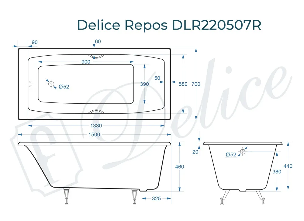 Для установки используются фирменные ножки Delice, которые имеют надежное и прочное крепление, обеспечивают высокую устойчивость ванны и регулируются по высоте. Высота на ножках варьируется от 59.5 до 64.5 см. Ножки выполнены из высокопрочного чугуна марки СЧ25, который выдерживает большие нагрузки. Для модели Repos подходит комплект ножек для серии Comfort.