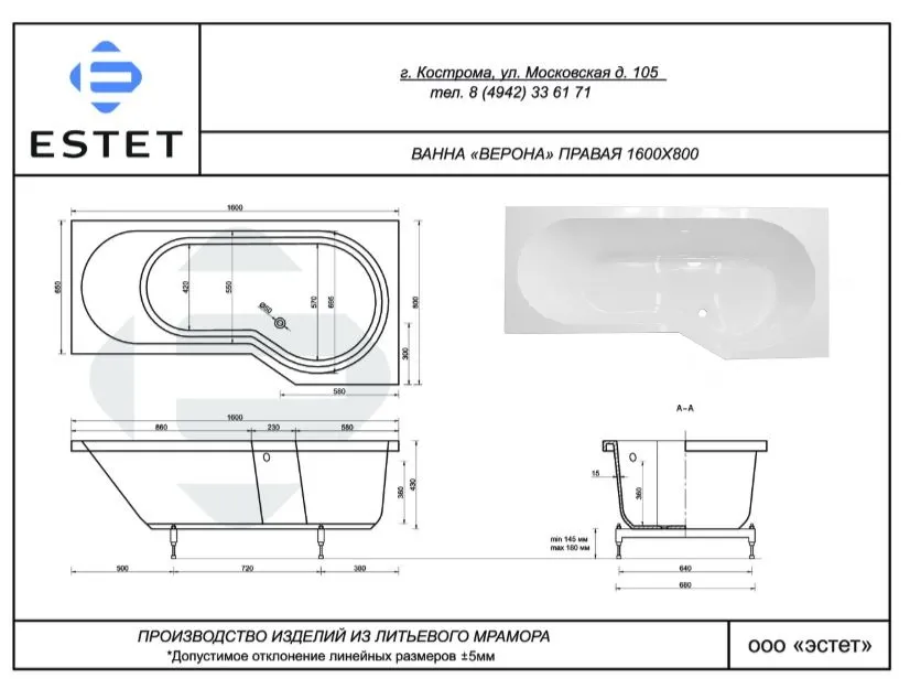 Ванна из литого мрамора Эстет Verona silk 160x80 правая, белая матовая