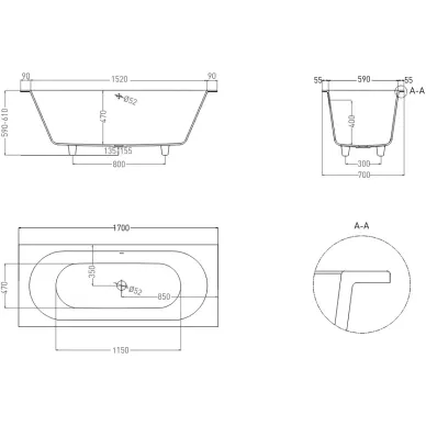 Она предназначена как для полного или частичного встраивания, так и для пристенной или угловой установки. Ванна характеризуется одинаковым уклоном бортов и расположенными посередине сливом-переливом и донным клапаном. Название модели Axis («Ось) отражает характерную симметрию ванны во фронтальной проекции.