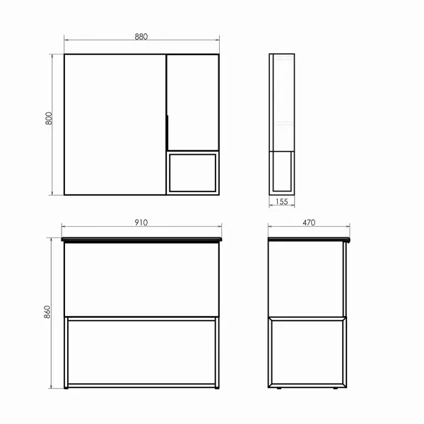 Створка оснащена петлями с механизмом плавного закрывания. Высококачественное зеркальное полотно с амальгамой на основе серебра. Корпус и фасад из влагостойкого ЛДСП Дуб темно-коричневый. За створкой одна горизонтальная полка. Под шкафчиком размещена зона открытого хранения из черного металлического профиля для размещения предметов для умывания.