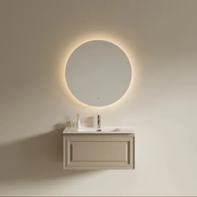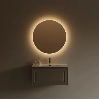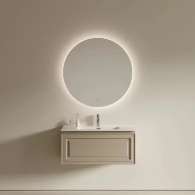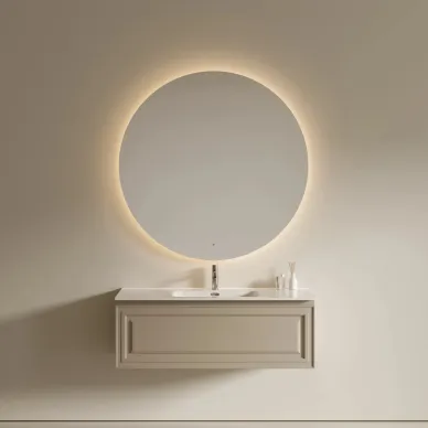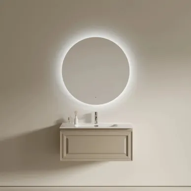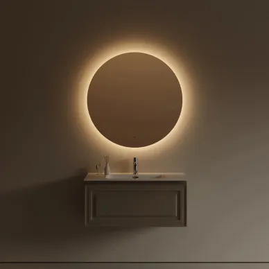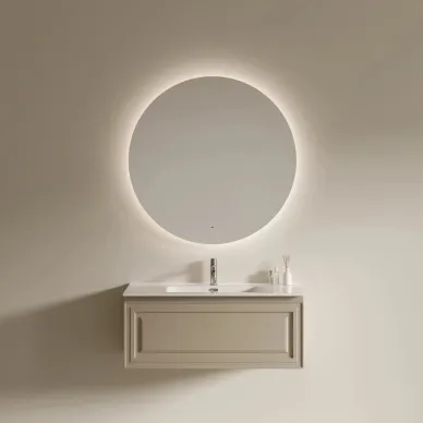 - На изображении зеркало представлено с коллекцией мебели Folk и смесителем из коллекции Etna.