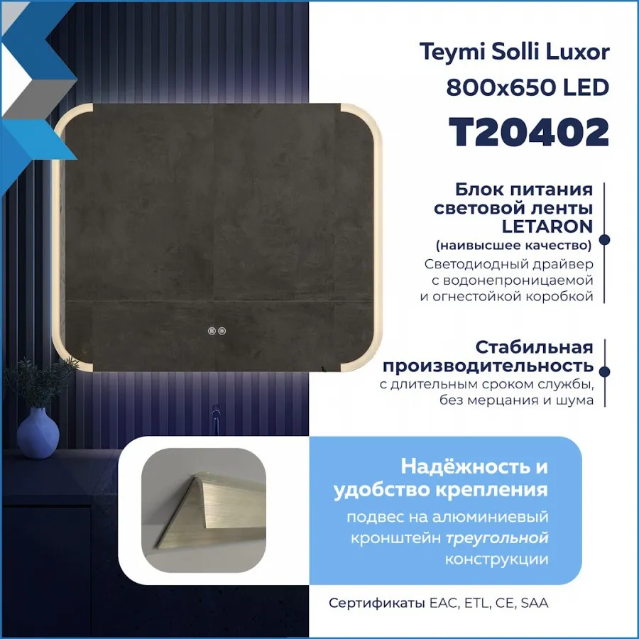 Зеркало Teymi Solli Luxor 800х650, LED подсветкой, сенсорным управлением и функцией антипар – это идеальное решение для вашей ванной комнаты. Модель Luxor T20402 классической формы с закругленными углами, станет идеальным украшением в интерьере вашей ванной комнаты.