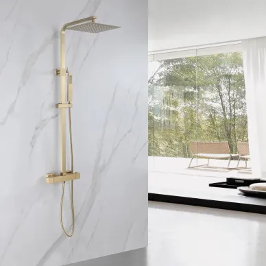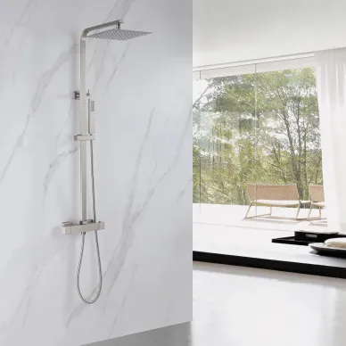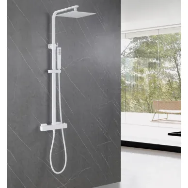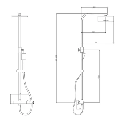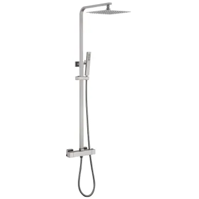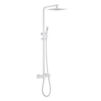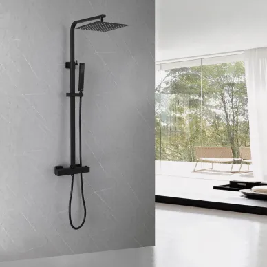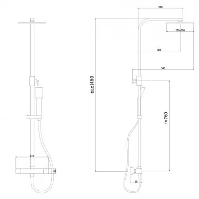 - Комплектация: смеситель, термостат, кронштейн, шланг, держатель, лейка, стойка, верхний душ