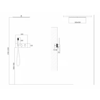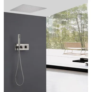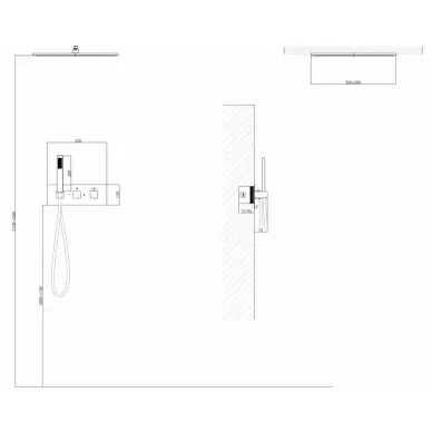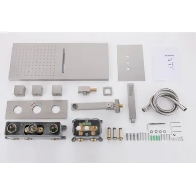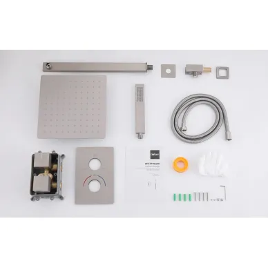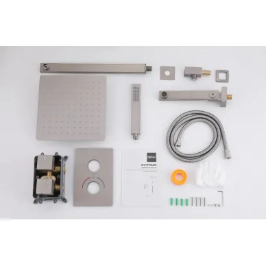- Комплектация: смеситель, термостат, шланг, держатель, лейка, верхний душ, излив