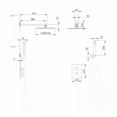 - Комплектация: смеситель, термостат, шланг, держатель, лейка, верхний душ