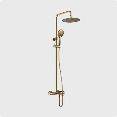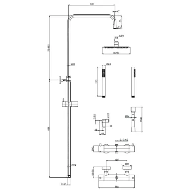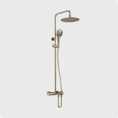 - Комплектация: смеситель, термостат, кронштейн, шланг, держатель, лейка, стойка, полочка, верхний душ, излив