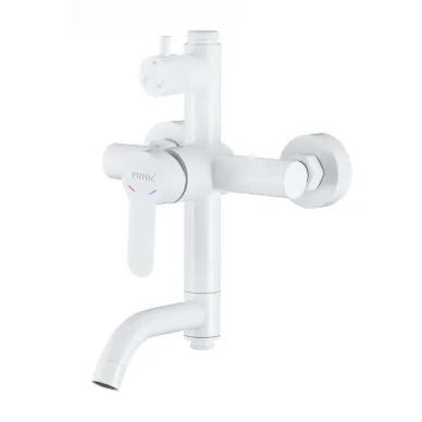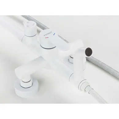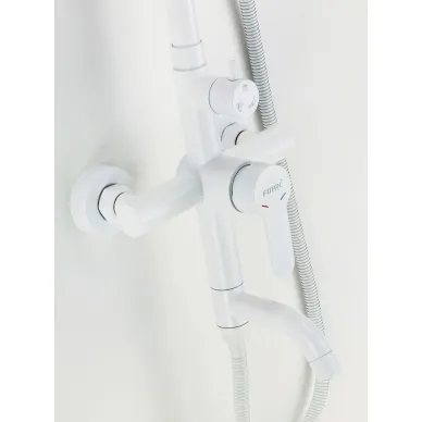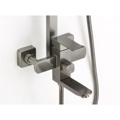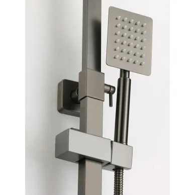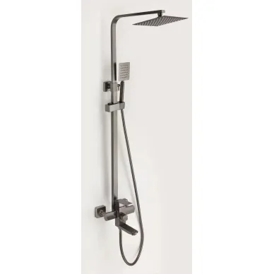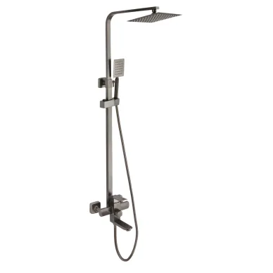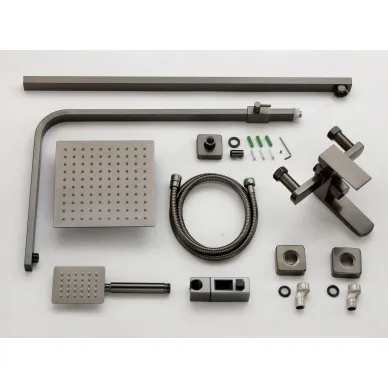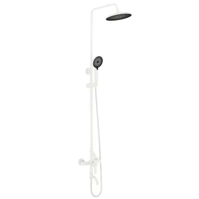- Комплектация: смеситель, кронштейн, шланг, держатель, лейка, стойка, верхний душ, излив
