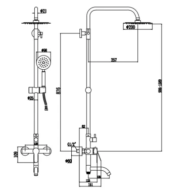- Комплектация: смеситель, кронштейн, лейка, стойка, верхний душ