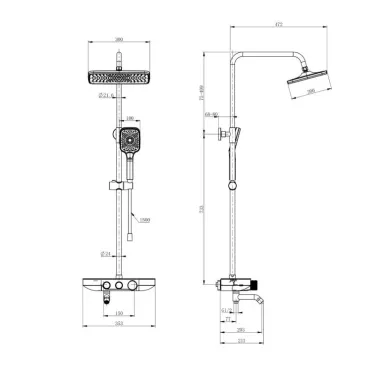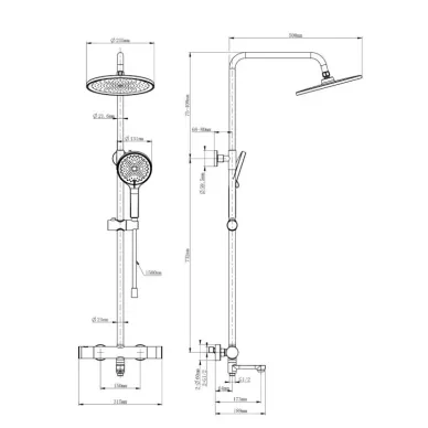 - Комплектация: смеситель, термостат, кронштейн, шланг, держатель, лейка, стойка, верхний душ