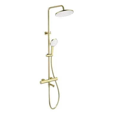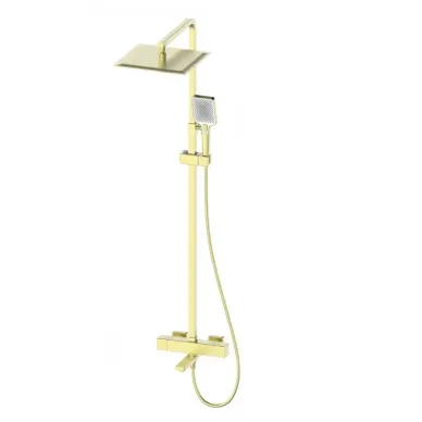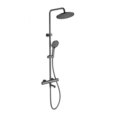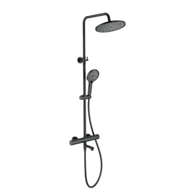 - Комплектация: смеситель, термостат, шланг, держатель, лейка, стойка, верхний душ, излив