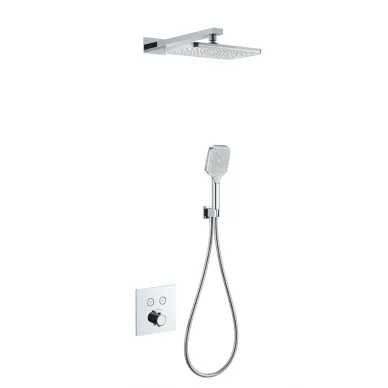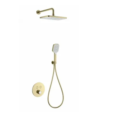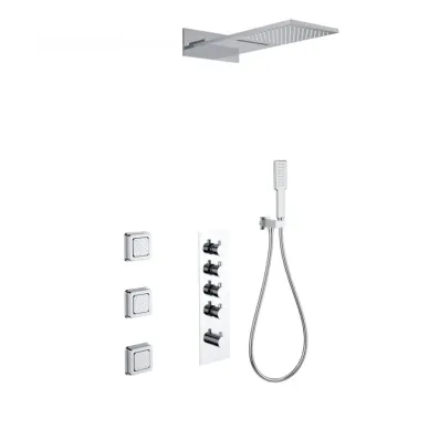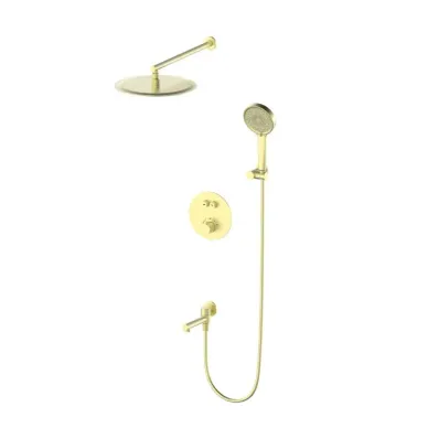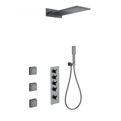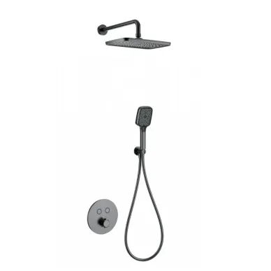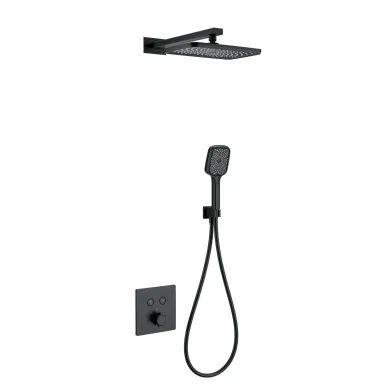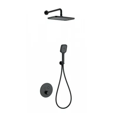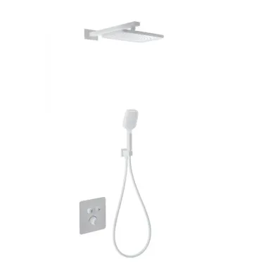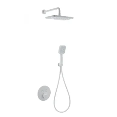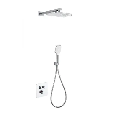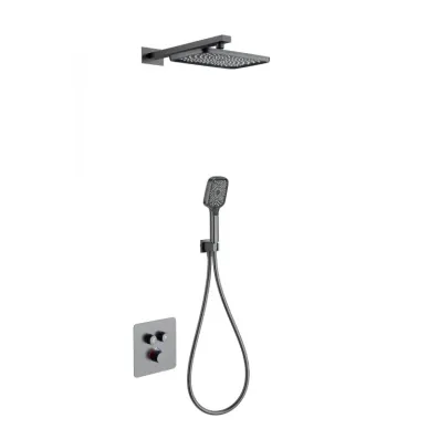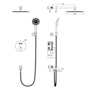 - Комплектация: смеситель, термостат, кронштейн, шланг, держатель, лейка, верхний душ