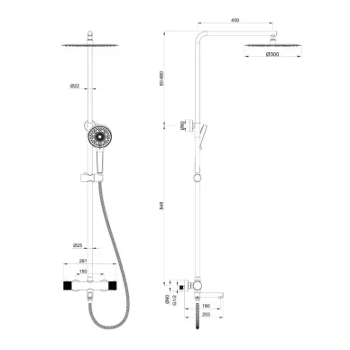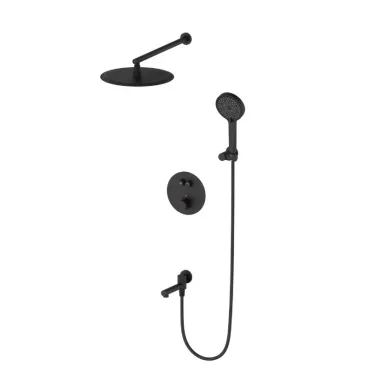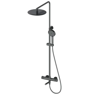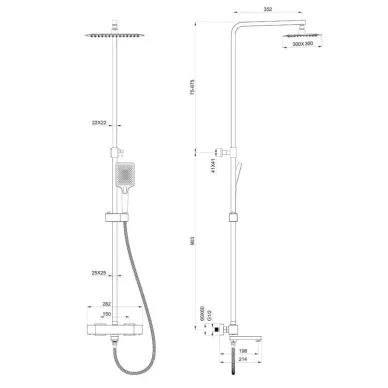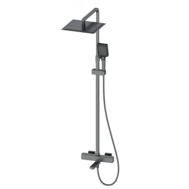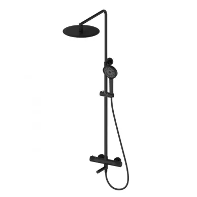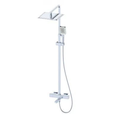 - Комплектация: смеситель, термостат, кронштейн, шланг, держатель, лейка, стойка, верхний душ, излив