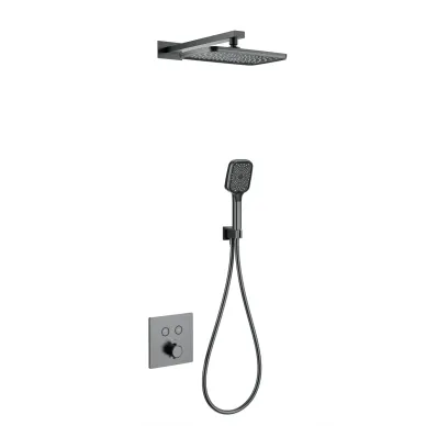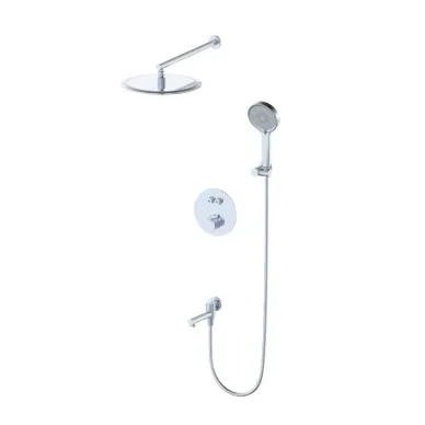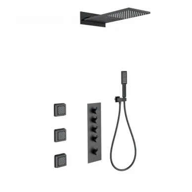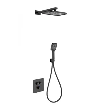 - Комплектация: смеситель, термостат, механизм, шланг, держатель, лейка, верхний душ