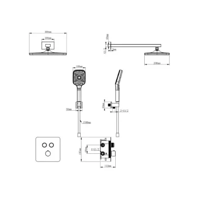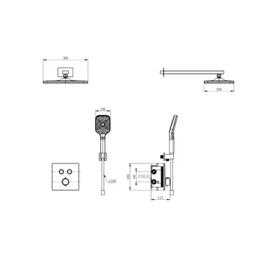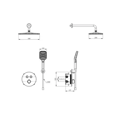 - Комплектация: смеситель, термостат, кронштейн, механизм, шланг, держатель, лейка, верхний душ, излив