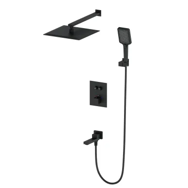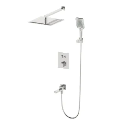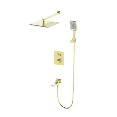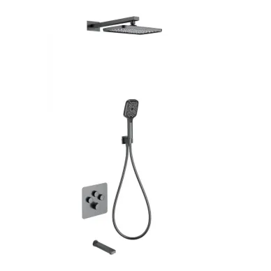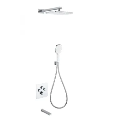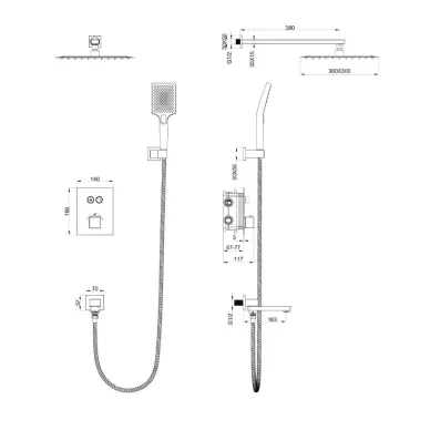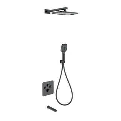 - Комплектация: смеситель, термостат, механизм, шланг, держатель, лейка, верхний душ