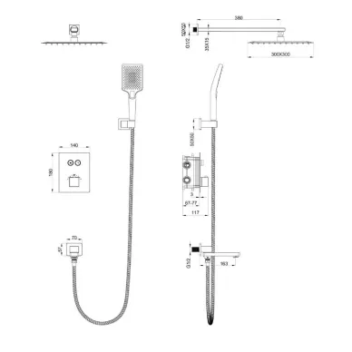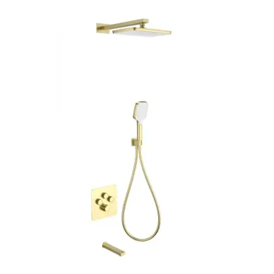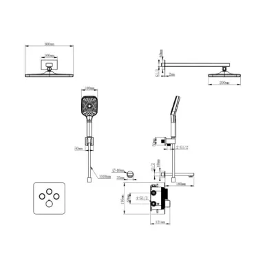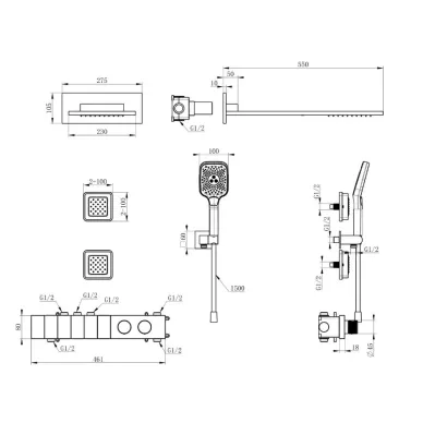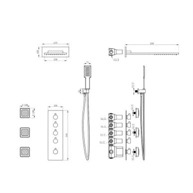 - Комплектация: смеситель, термостат, кронштейн, механизм, шланг, держатель, лейка, верхний душ, излив