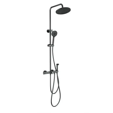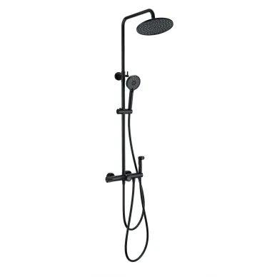 - Комплектация: смеситель, термостат, шланг, держатель, лейка, стойка, верхний душ