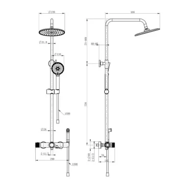 - Комплектация: смеситель, термостат, кронштейн, шланг, держатель, лейка, стойка, верхний душ