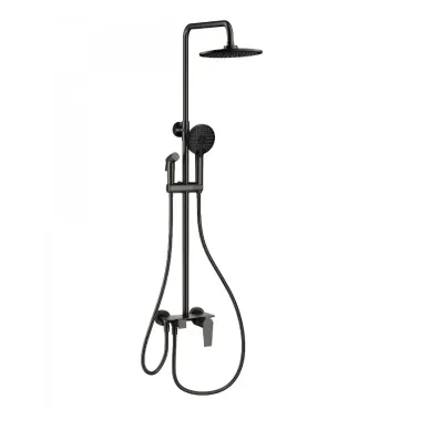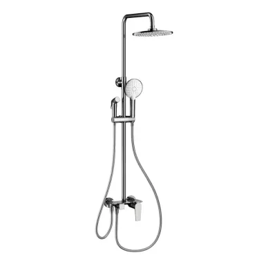 - Комплектация: смеситель, кронштейн, шланг, держатель, лейка, стойка, верхний душ, излив