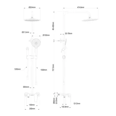 - Комплектация: смеситель, кронштейн, шланг, держатель, лейка, стойка, полочка, верхний душ