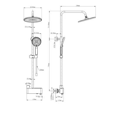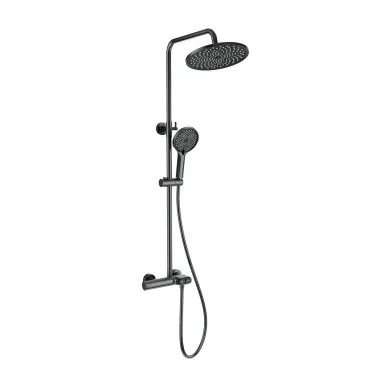 - Комплектация: смеситель, термостат, шланг, держатель, лейка, стойка, верхний душ